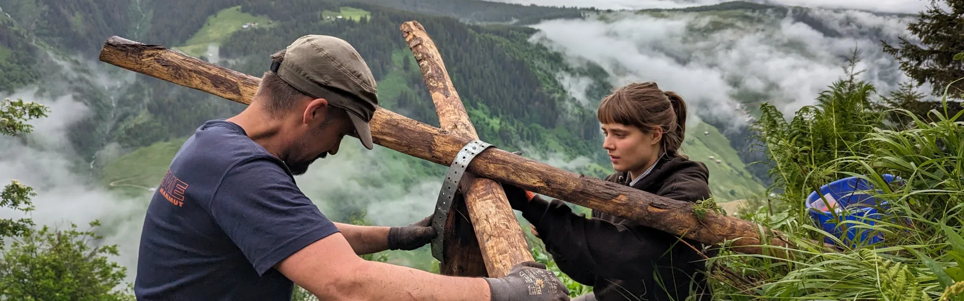 - Bau von Dreibeinböcken: Diese Holzkonstruktionen mindern den Schneedruck und sichern den Jungwuchs oberhalb der Waldgrenze.
